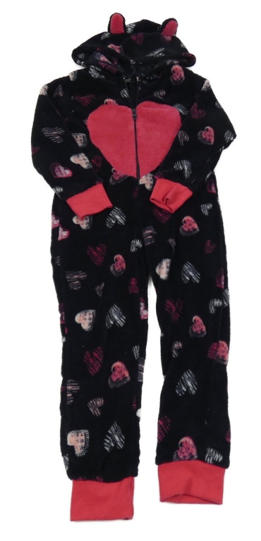 Tmavomodro/růžová plyšová kombinéza se srdíčky a kapucí s oušky AVENUE