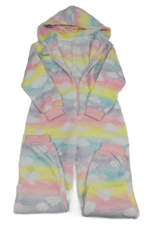 Barevná pruhovaná chlupatá kombinéza s mráčky a kapucí