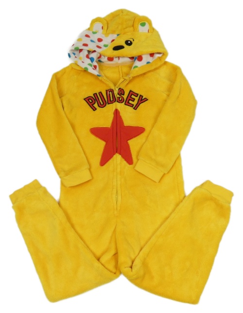 • Žlutá plyšová kombinéza s kapucí - medvídek Pudsey George