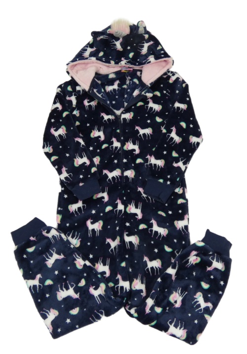 Tmavomodrá plyšová kombinéza s jednorožci a kapucí