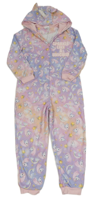 Lila-světlerůžová lehká fleecová kombinéza s jednorožci a kapucí