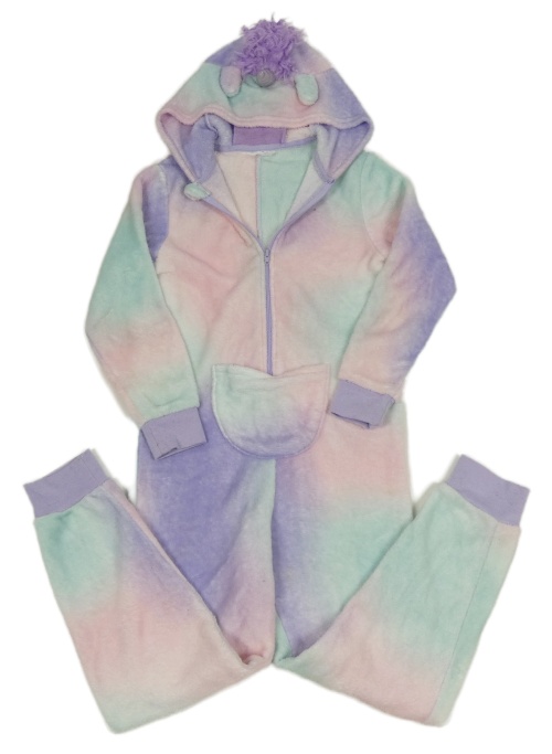 Růžovo-mátovo-lila chlupatá kombinéza s kapucí - jednorožec