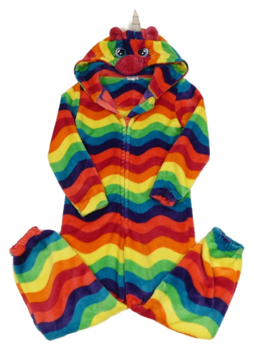 Barevná pruhovaná chlupatá kombinéza s kapucí - jednorožec