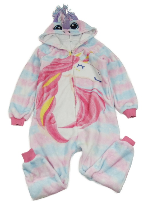 Růžovo-světlemodrá chlupatá kombinéza s jednorožcem a kapucí