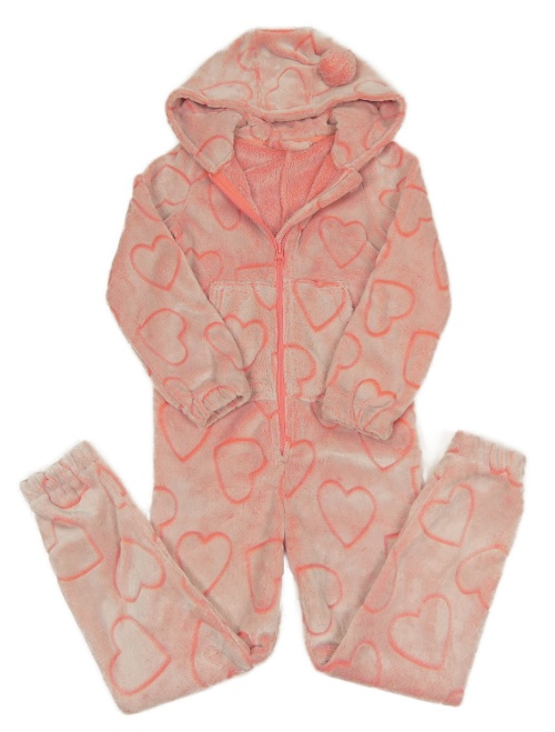 Neonově korálovo-bílá plyšová kombinéza se srdíčky a kapucí s bambulí Nutmeg