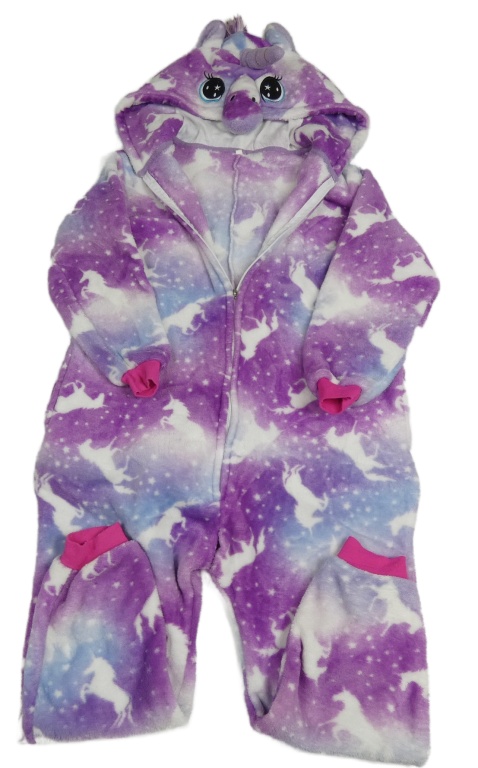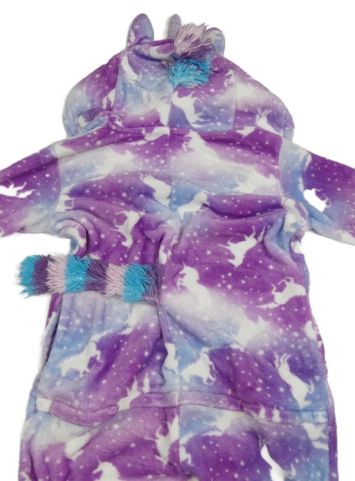 Purpurovo-modro-tmavorůžová plyšová kombinéza s jednorožci a kapucí