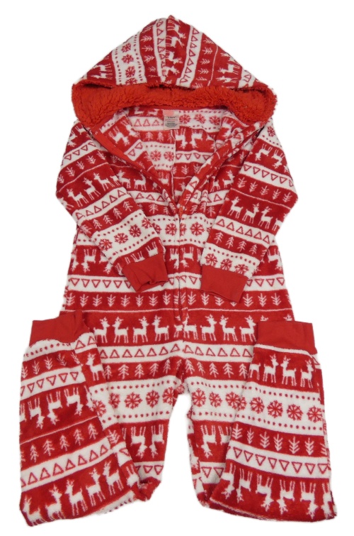 Červeno-bílá vzorovaná plyšová kombinéza se soby a kapucí
