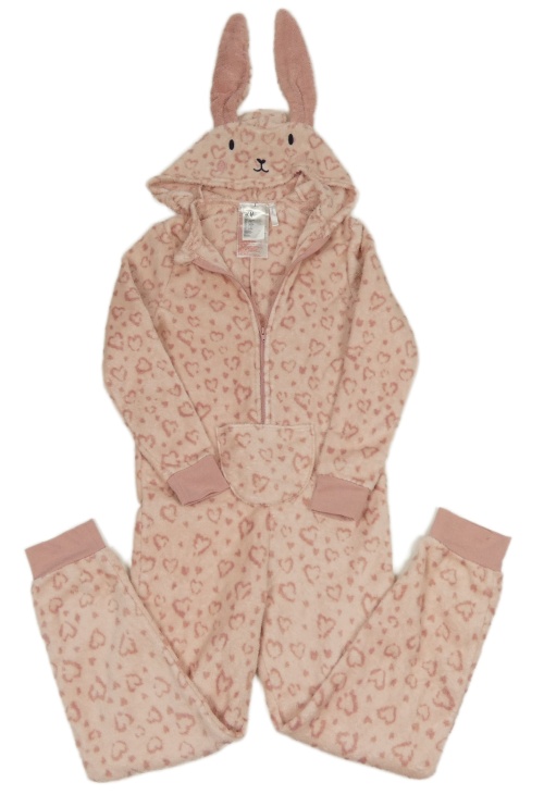 Růžová chlupatá kombinéza se srdíčky a kapucí s oušky - králík H&M
