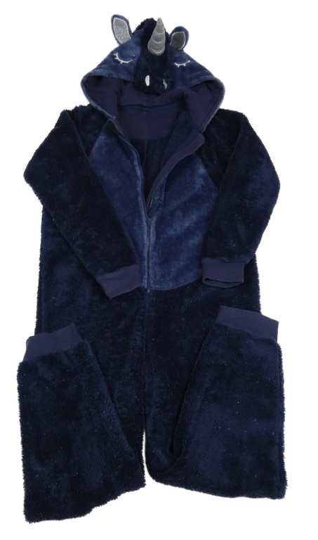 Tmavomodrá třpytivá chlupatá kombinéza s kapucí - jednorožec M&S