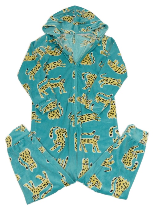 Tyrkysová plyšová kombinéza s leopardy a kapucí Tu