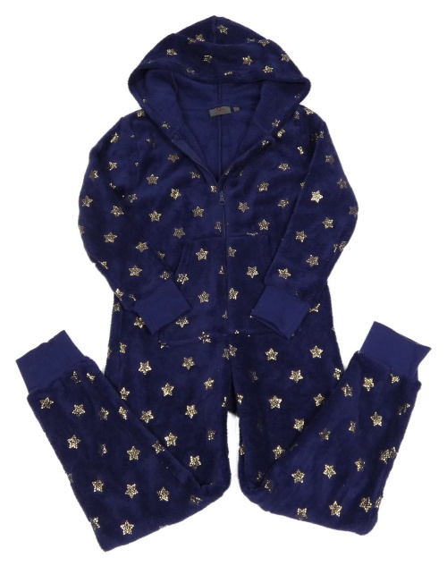 Tmavomodrá chlupatá kombinéza s hvězdami a kapucí