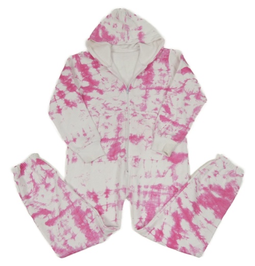 Bílo-tmavorůžová batikovaná tepláková kombinéza s kapucí