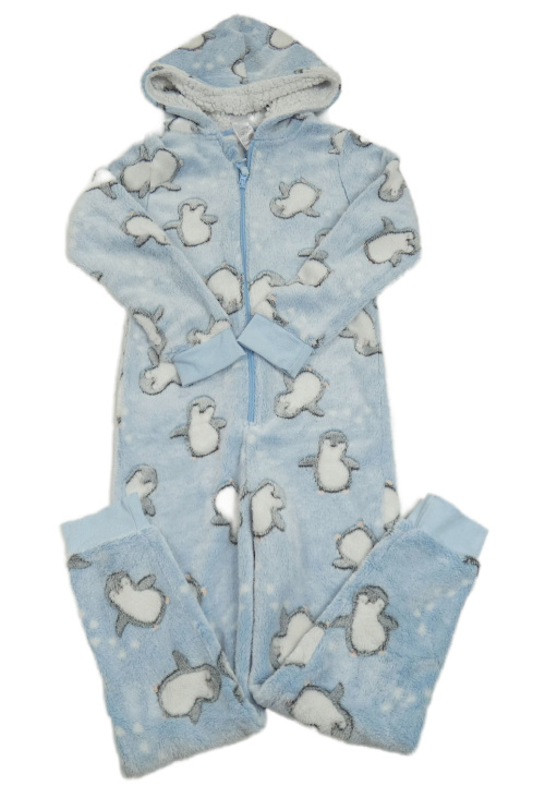 Světlemodrá chlupatá kombinéza s tučňáky s kapucí Peacocks