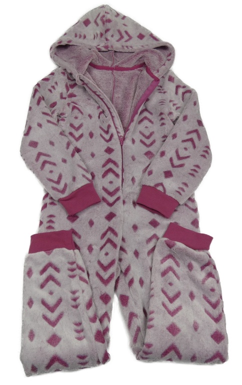 Fialová vzorovaná plyšová kombinéza s kapucí