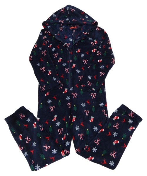 • Tmavomodrá plyšová kombinéza s vánočními obrázky a kapucí