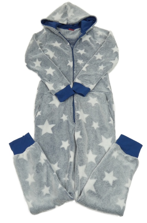 • Tmavomodro-bílá plyšová kombinéza s hvězdičkami a kapucí