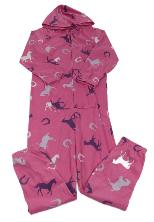 Růžová fleecová kombinéza s koníky a kapucí