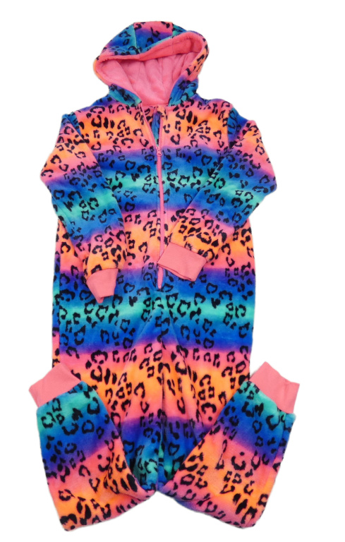 Barevná chlupatá kombinéza s leopardím vzorem a kapucí St. Bernard