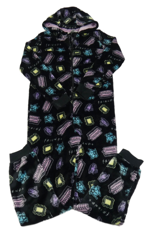 Černá plyšová kombinéza s obrázky - Frineds a kapucí