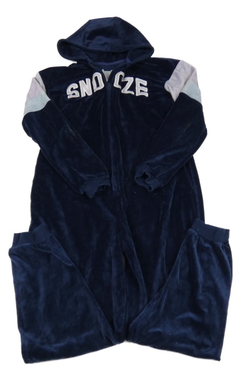 Tmavomodro-lila-šedá plyšová kombinéza s nápisem a kapucí George