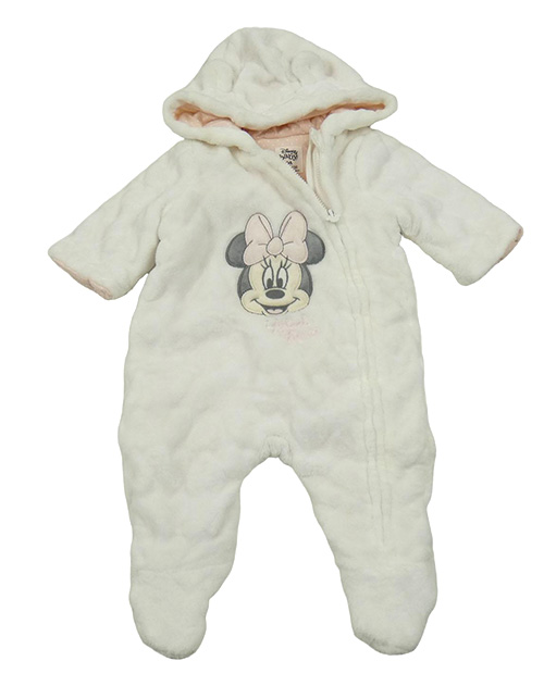 Bílá vzorovaná chlupatá zateplená kombinéza s Minnie a kapucí C&A