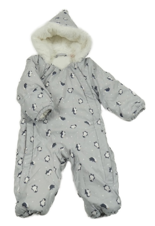 • Světlešedá šusťáková zimní kombinéza s tučňáčky a kapucí s kožešinou a bambulí H&M