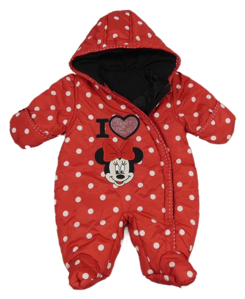 Červená puntíkatá šusťáková zimní kombinéza s Minnie a kapucí George