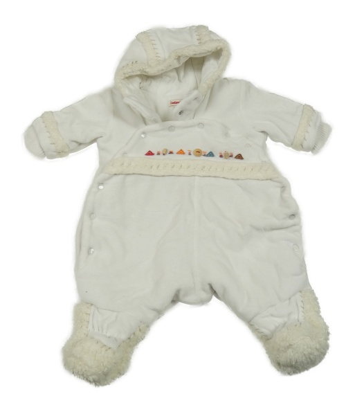 • Bílá sametová zateplená kombinéza s nášivkami a kapucí