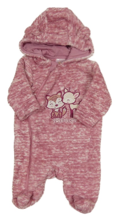 Starorůžová melírovaná plyšová kombinéza se zvířátky a kapucí