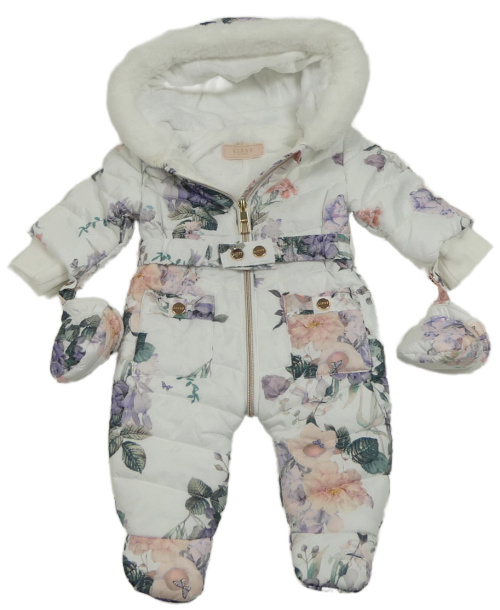 Bílá květovaná šusťáková zimní kombinéza s páskem a kapucí+ rukavice Lipsy London