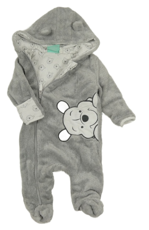 Šedo-bílá melírovaná plyšová podšitá kombinéza s Pú a kapucí Disney
