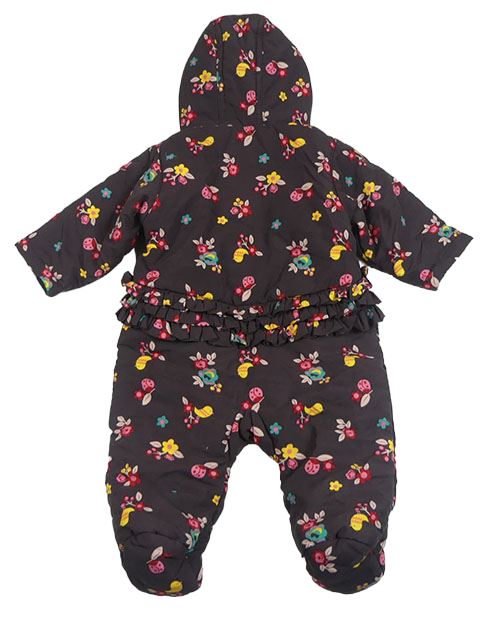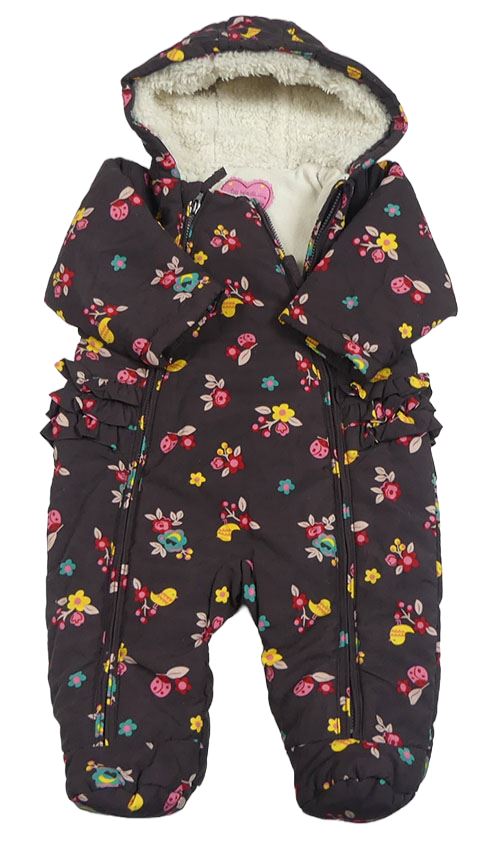 Tmavohnědá šusťáková zimní kombinéza s kytičkami a beruškami a ptáčky a volánky a kapucí M&S