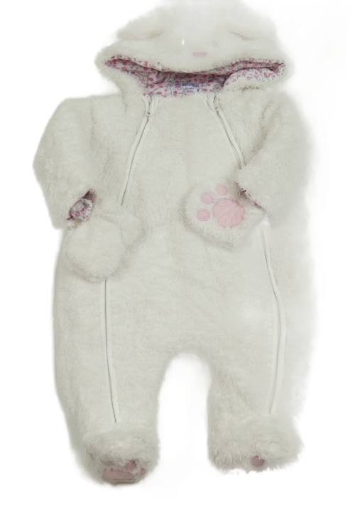 Bílá chlupatá zateplená kombinéza s kapucí + rukavice Jojo Maman Bébé
