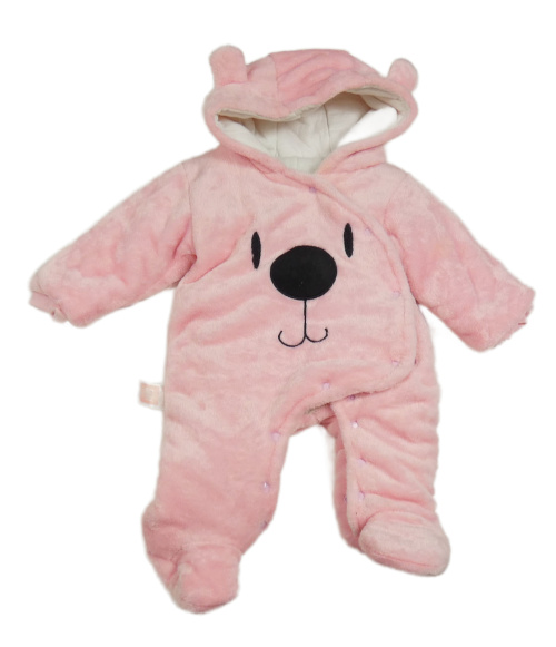 Růžová chlupatá zateplená kombinéza s medvědem a kapucí