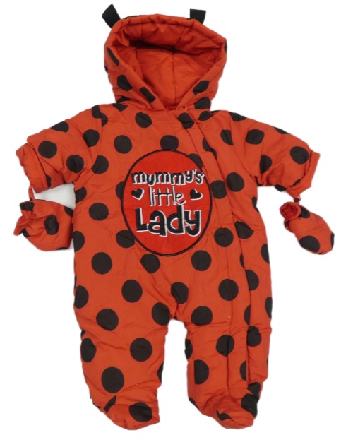 Nové - Červeno-černá puntíkatá šusťáková zimní kombinéza s nápisem a kapucí + rukavice