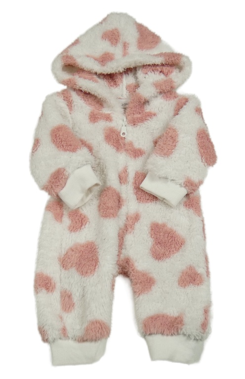 Bílá chlupatá kombinéza se srdíčky a kapucí