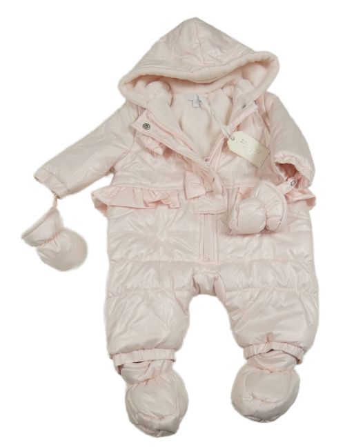 Nové - Světlerůžová šusťáková zimní kombinéza s volánky a kapucí + rukavice + capáčky