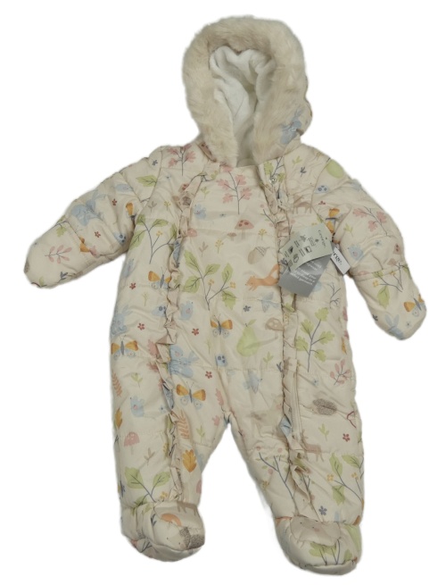 Nové - smetanová prošívaná šusťáková zimní kombinéza s obrázky a volánky a kapucí s kožešinou George