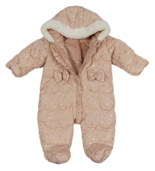 Světlerůžová prošívaná šusťáková zimní kombinéza se zlatými hvězdičkami a mašlemi a volánkem a kapucí s kožešinou Matalan