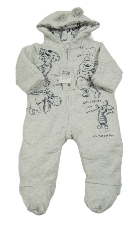 • Nové - šedo-bílá melírovaná zateplená kombinéza s Pú s kamarády a kapucí s oušky George