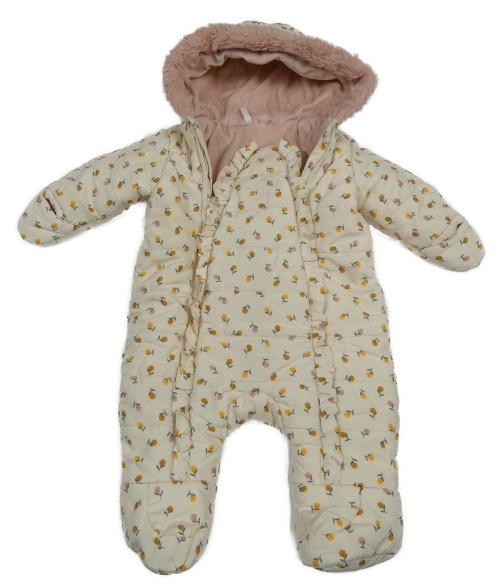 • Smetanová prošívaná šusťáková zimní kombinéza s kytičkami a volánky a kapucí s kožešinou