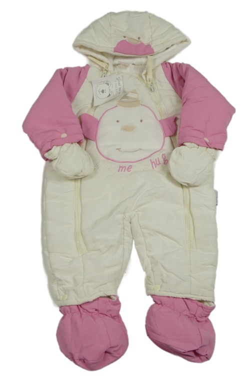 • Nové- bílo-růžová šusťáková zimní kombinéza s klaunem a kapucí+ rukavice+ capáčky