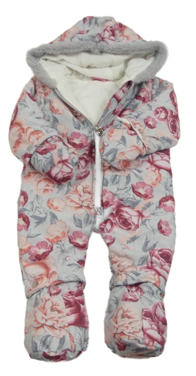 Šedo-růžová květovaná šusťáková zimní kombinéza s kapucí