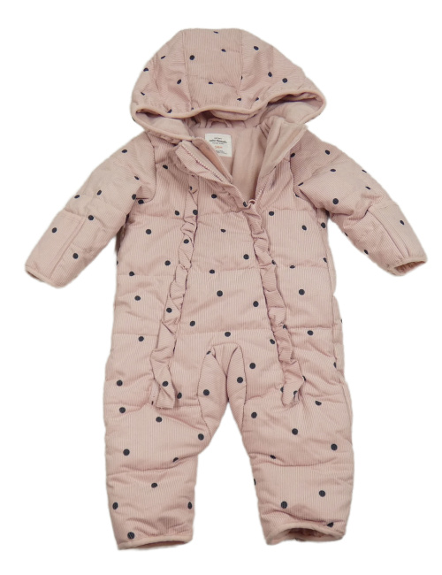 Růžová žebrovaná puntíkatá šusťáková zimní kombinéza s volánky a kapucí