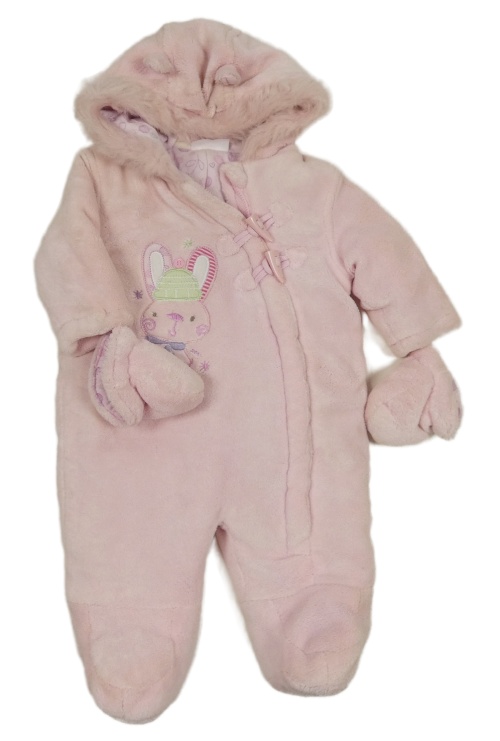 Růžová chlupatá zateplená kombinéza s králíkem a kapucí + rukavice