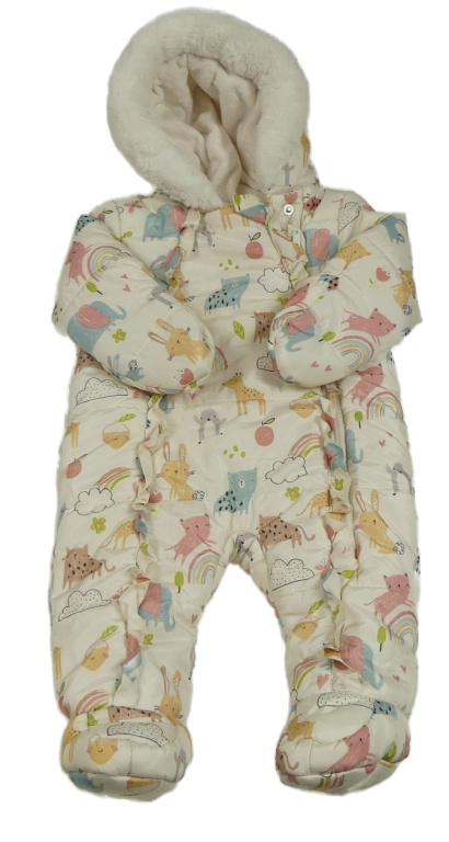 • Smetanová prošívaná šusťáková zimní kombinéza se zvířátky a obrázky a volánky a kapucí s kožešinou George