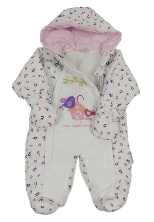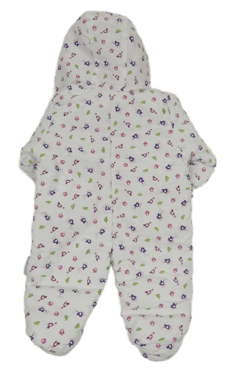 Bílá šusťáková zimní kombinéza s obrázky a kapucí