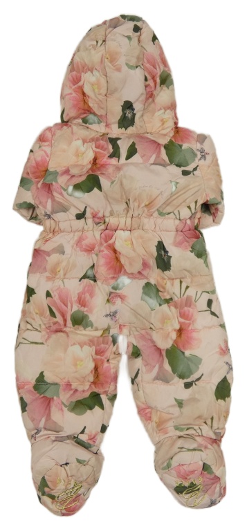 • Světlerůžová prošívaná šusťáková zimní kombinéza s růžemi a kapucí s kožešinou Ted Baker