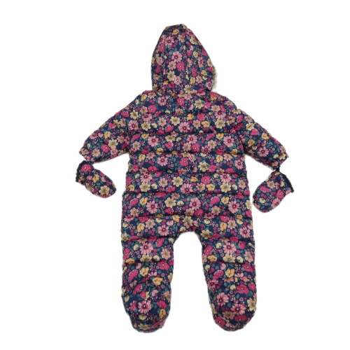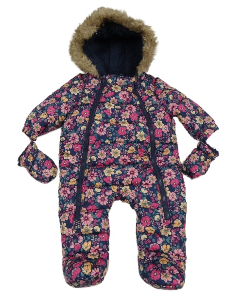 Tmavomodrá prošívaná šusťáková zimní kombinéza s kytičkami a kapucí s kožešinou + rukavice F&F