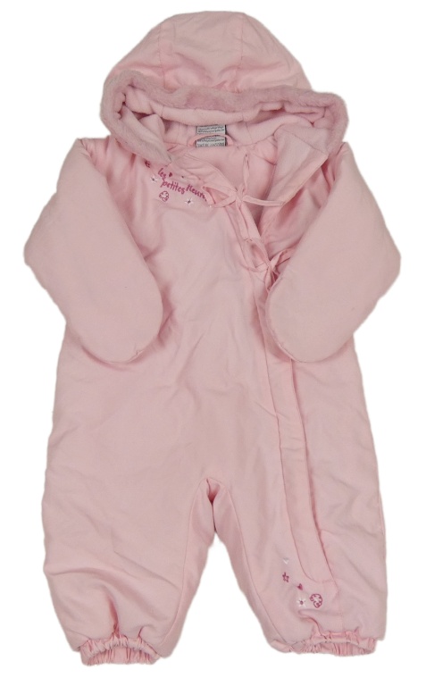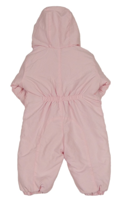 • Světlerůžová šusťáková zimní kombinéza s nápisem a mašlemi a kapucí s kožešinou